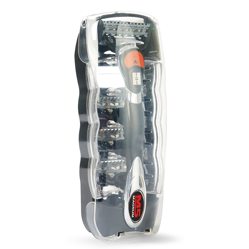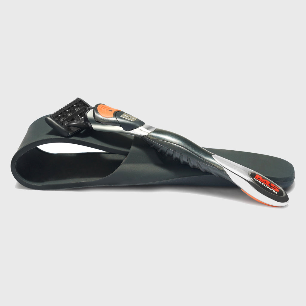The Magnum V razor brings you a ground-breaking shaving technology in a timelessly elegant design that epitomizes form and function. The razor features everything you need for a close and comfortable shave: five ultra-sharp blades, advanced lubricating strip, pivoting head, weighted core handle, rubberized grip and a precision trimmer.
