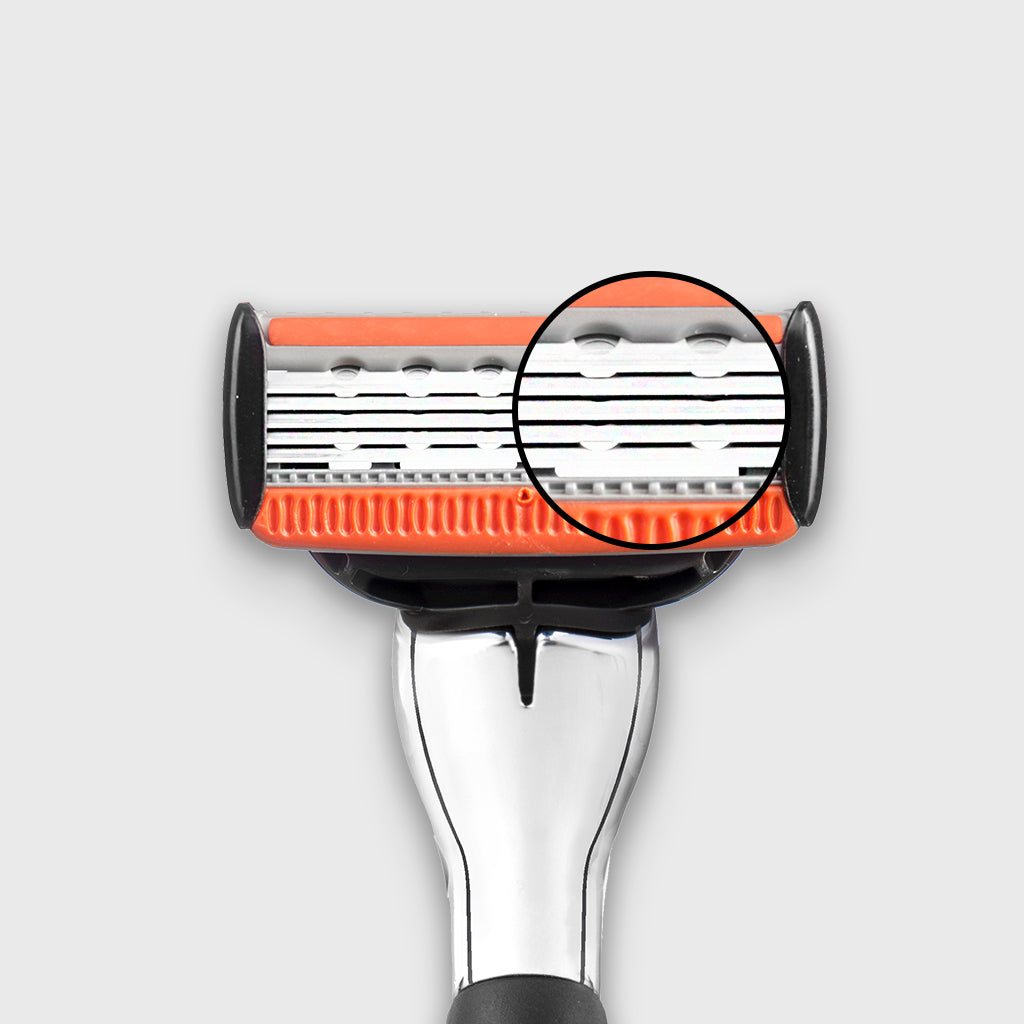 5 sharp blades on a pivoting "paintbrush" style head provide an exceptionally close shave. This unique design translates to a relatively large refill cartridge leading to a larger size passage, which allows shaving residue to pass through more smoothly, making it much easier to rinse and clean, both during and after use
