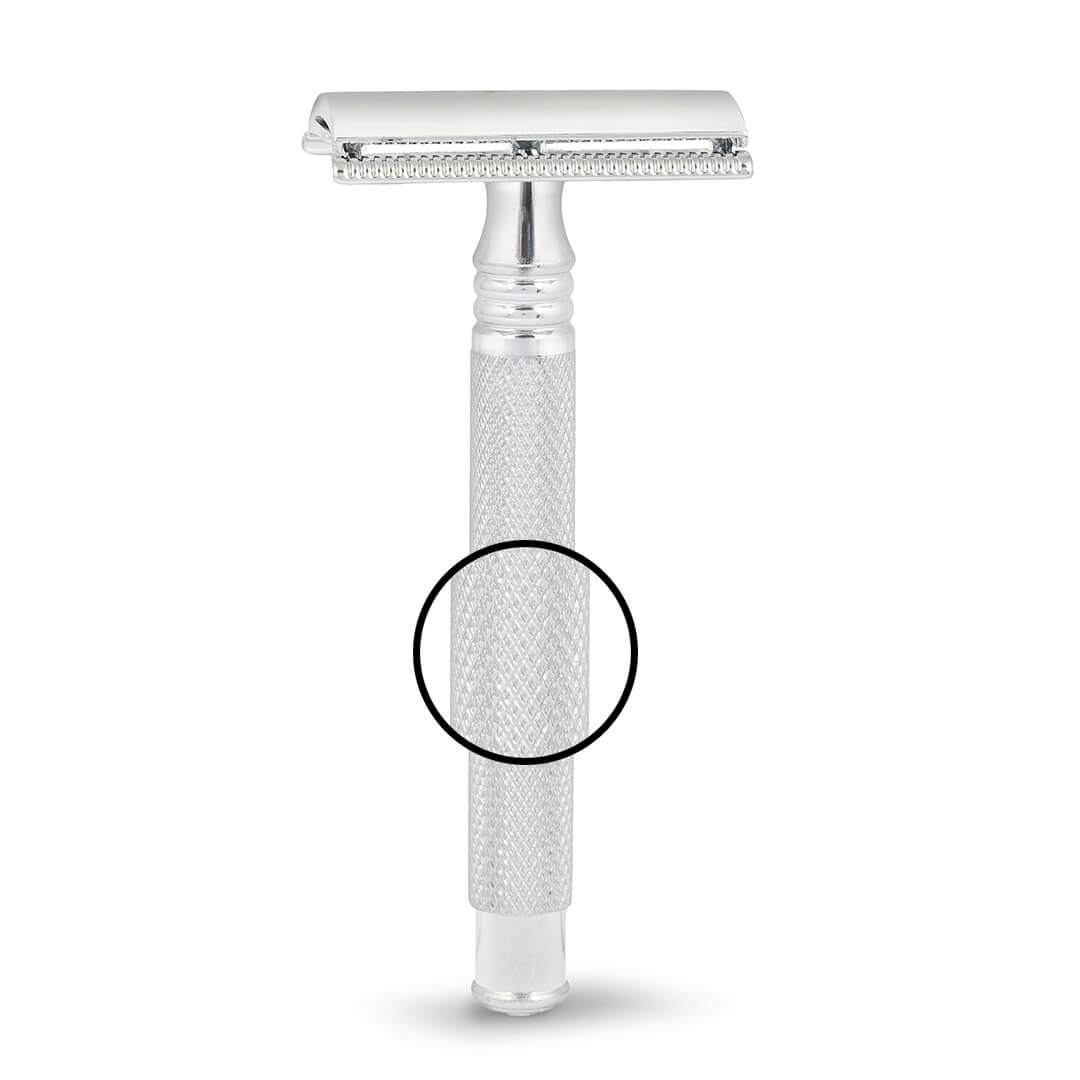 The safety razor features traditional length handle with a knurled grip for those who find a short handle more comfortable. Perfect for men with tough or very heavy beards.